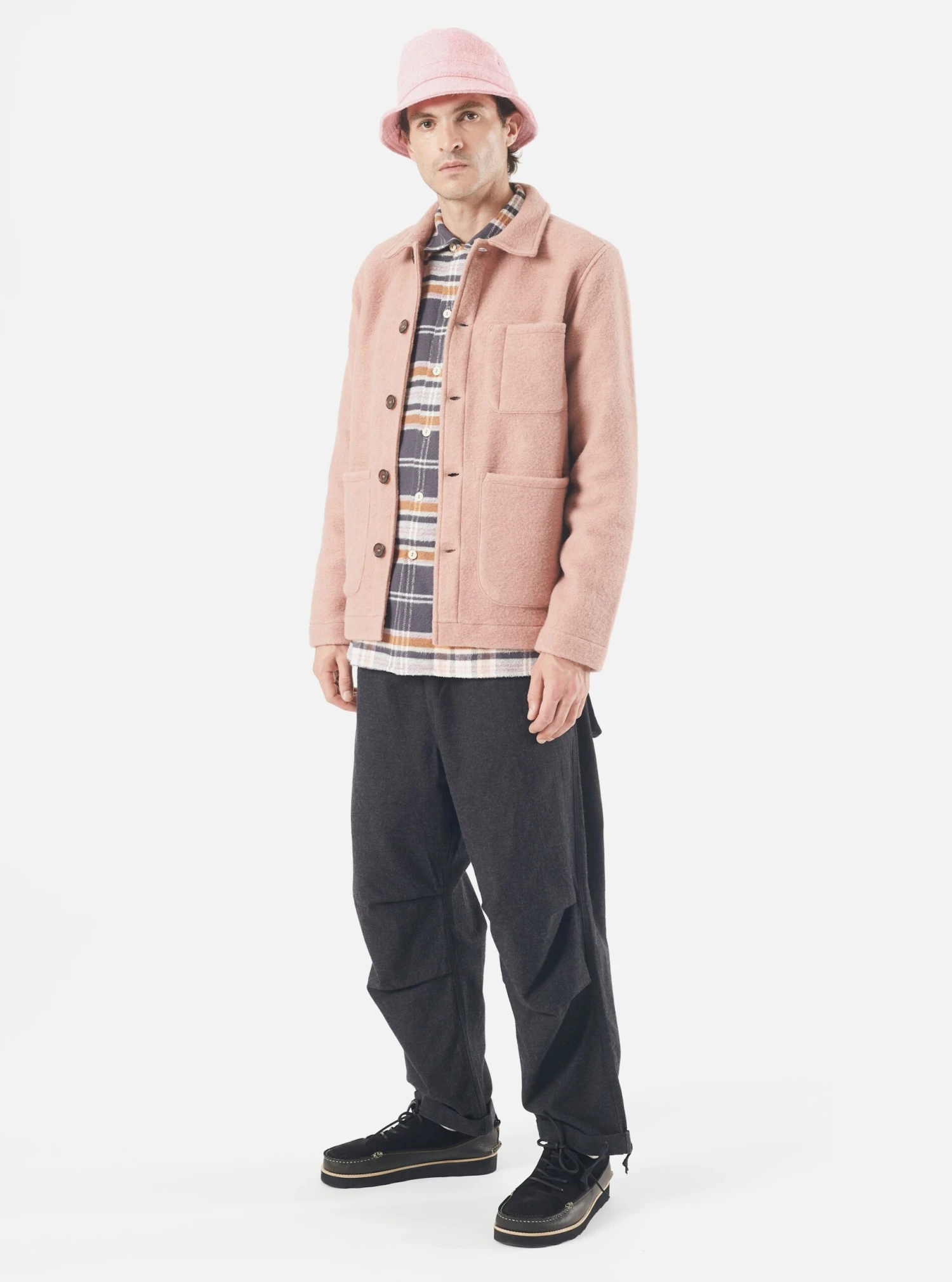 The ‘Field Jacket’ is a loose-fitting worker-style jacket. It has a super simple four-button front and three patch front pockets. The classic UW shape of a wide, loose, comfortable and modern jacket.