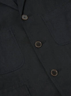 A loose, straight, and comfortable fit with a three-button front and a casual edge stitch detail on lapels and pockets.