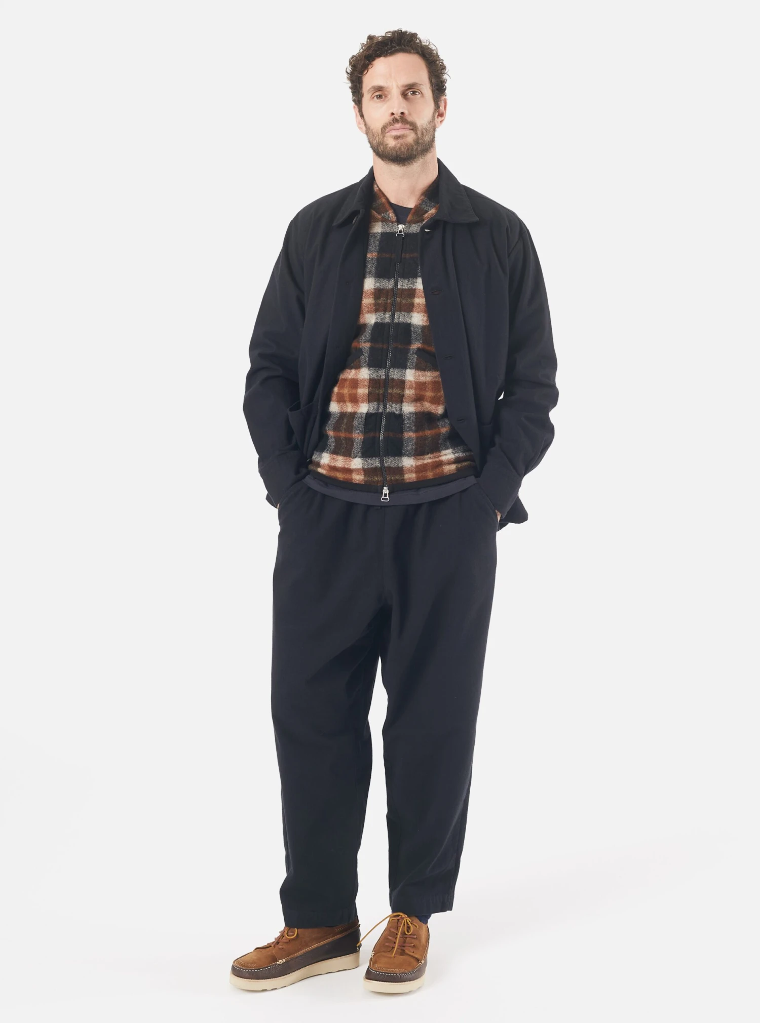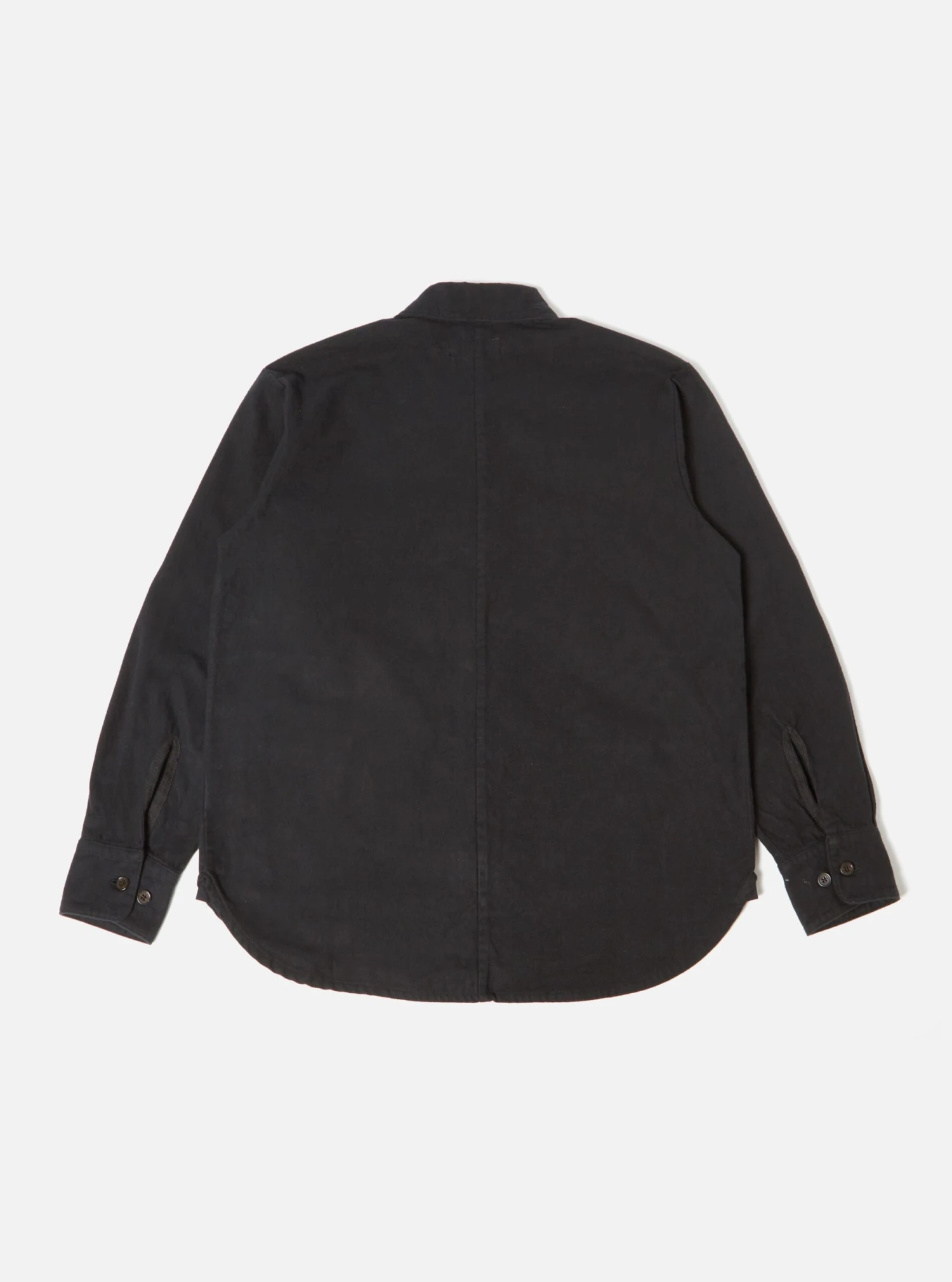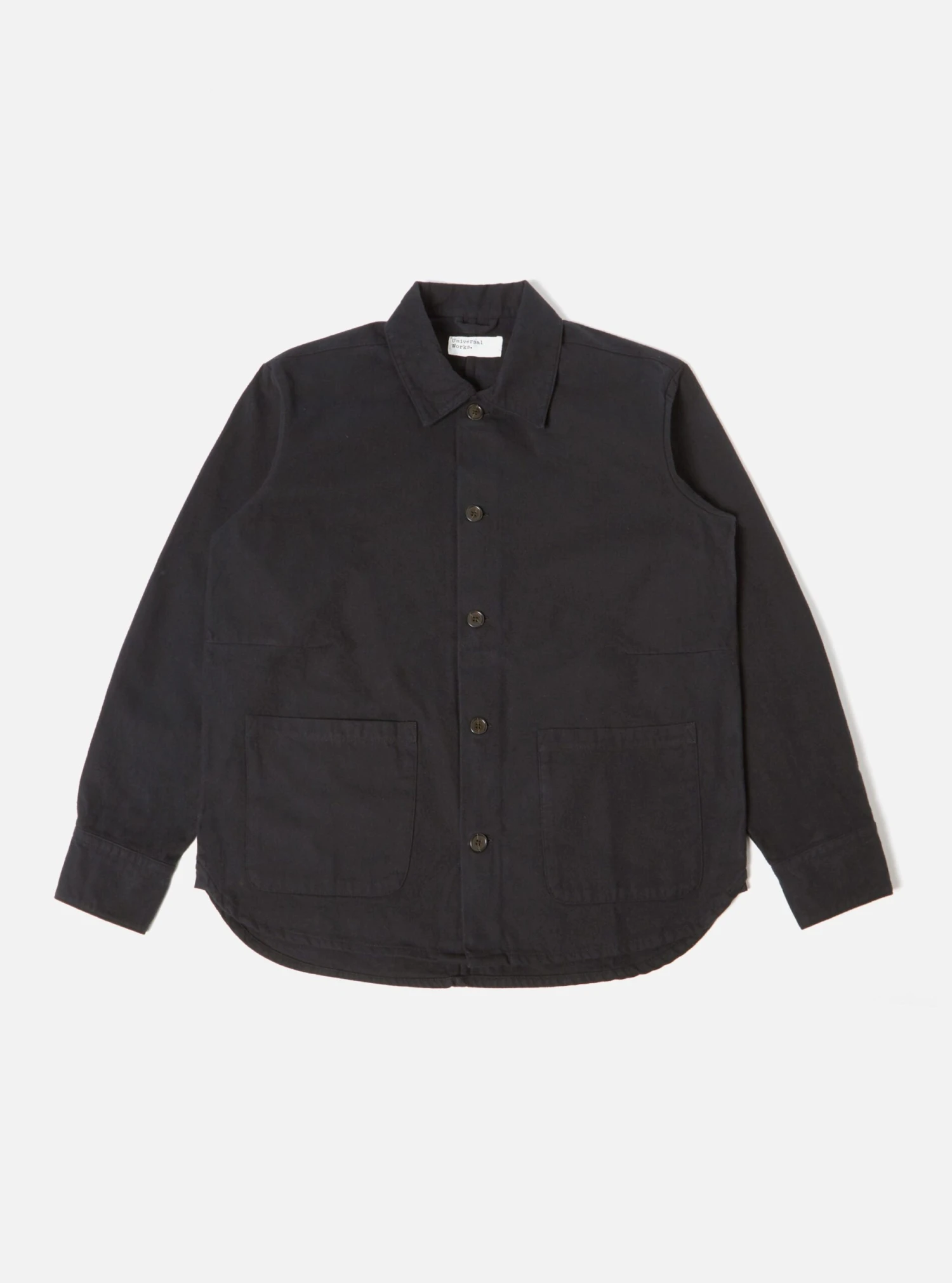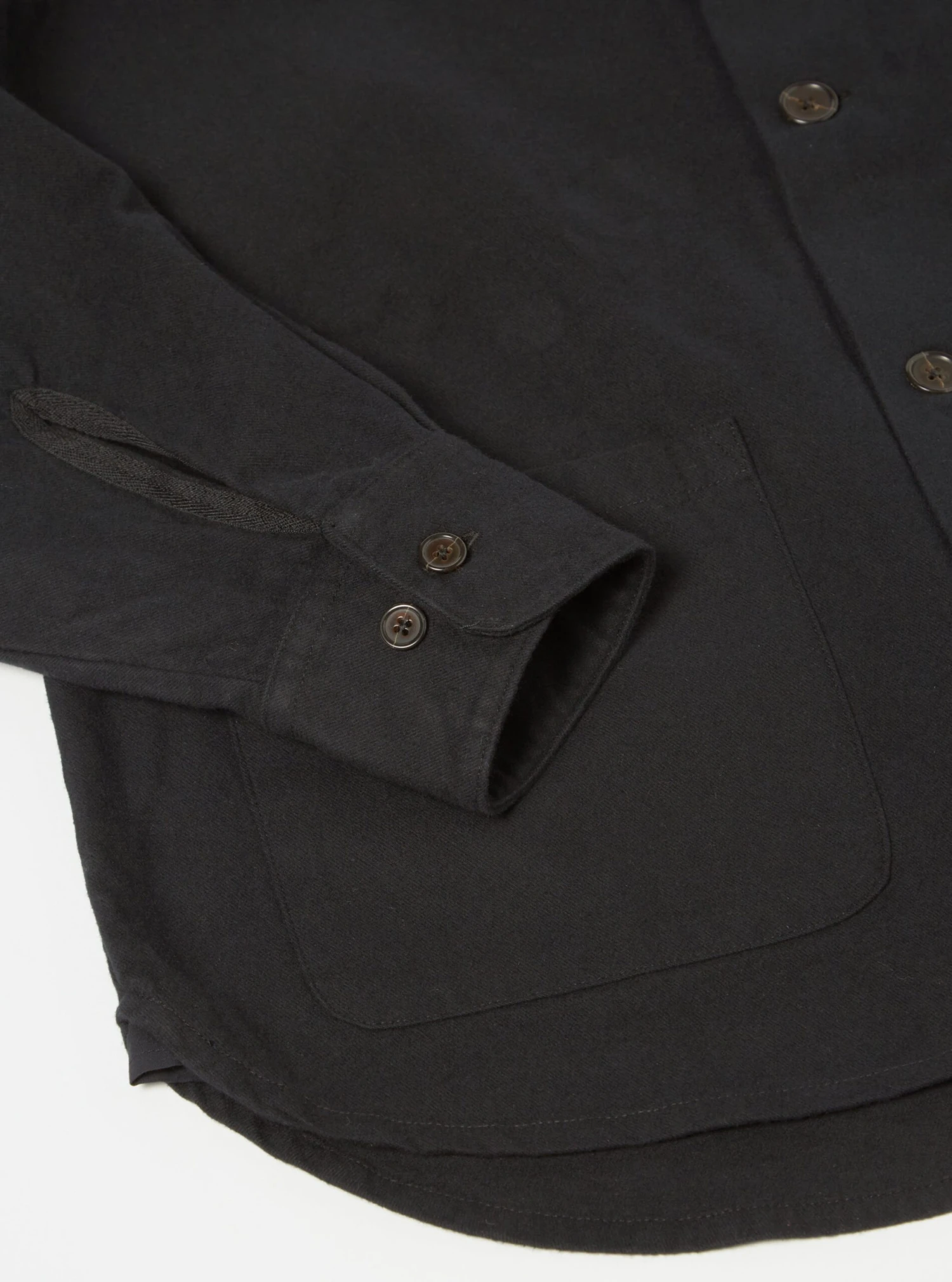 The Travail Shirt has a curved shirt-like hem, a contemporary oversized fit with lower, jacket-like pockets.